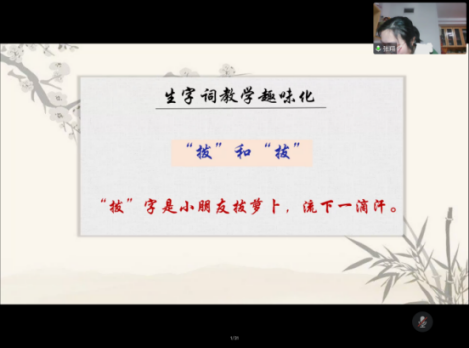 安庆市高琦小学语文教研组组长、安庆市教坛新星、安庆市十佳语文教师彭胄老师作了题为《“想把我说给你听”—小学语文教学的“人文性”和“趣味性”》讲座。彭老师以自己在教学初始的失败案例为导入,提出在课堂教学中除了要抓住工具性,更要积极关注人文性和趣味性。她认为,作为一名小学语文教师,要关注情感,只有与课本中的人物共情,才能打动学生。接着,她对小学低年级的生字词教学和高年级的古诗词教学方面,特别是在如何将枯燥的生字词教学趣味化,以及如何进行古诗词阅读教学等问题中提出了自己独到的见解。她表示古诗文教学要“读,查,品,延,归”的方法,在教学中要实现三读,读准字词,读准韵味,读出情感和诗中的人。最后,她讲述了作为班主任在班级管理中的三个烦心事,并都提供了应对的小妙招。