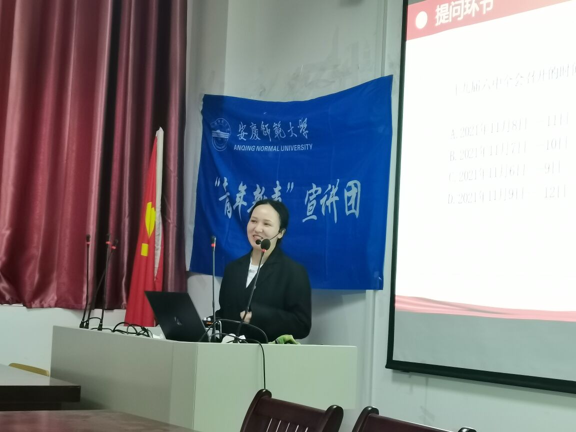 牢记初心担使命,砥砺前行谱新篇。为深入学习贯彻党的十九届六中全会精神,教育引导青年学生学习中国共产党百年奋斗的伟大成就和历史经验,4月29日下午,“青年新声”宣讲团在我院J305教室开展了“学习贯彻十九届六中全会精神,做新时代新青年”主题宣讲活动。本次活动的青年宣讲人为2021级思政专业研究生阿依努尔和2021级思想政治教育专业2班的卫宏婷、吴思齐。
