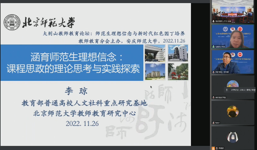 11月26日,教育部普通高校人文社会科学重点研究基地北京师范大学教师教育研究中心常务副主任、北京师范大学教育学部博士生导师李琼教授,应邀在线上作了题为“涵育师范生理想信念:课程思政的理论思考与实践探索”的学术报告。报告会由我院执行院长吴云助主持,信阳师范学院、黄冈师范学院和英国365集团的老师、研究生和本科生共800余人参与此次学术活动。