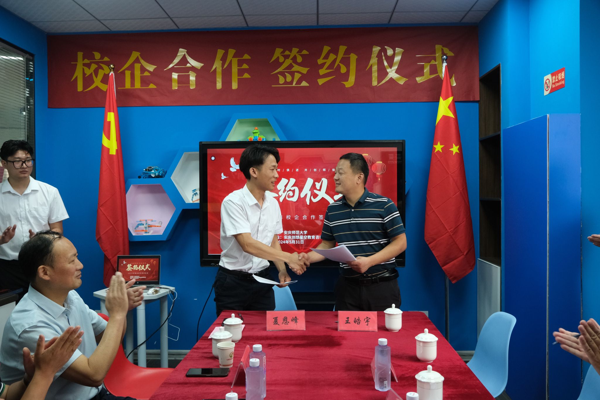 在揭牌仪式上,王皓宇、查怀志分别代表教师教育学院、教育技术学专业与安庆创想星空教育咨询有限公司签订教育实践基地、校企合作横向项目——“英国365集团教育技术与创客教育人才培养基地”,进一步推动双方优质资源的互通互融,共同发展。(撰稿:韦伟 摄影:朱斌彬 审核:王皓宇)