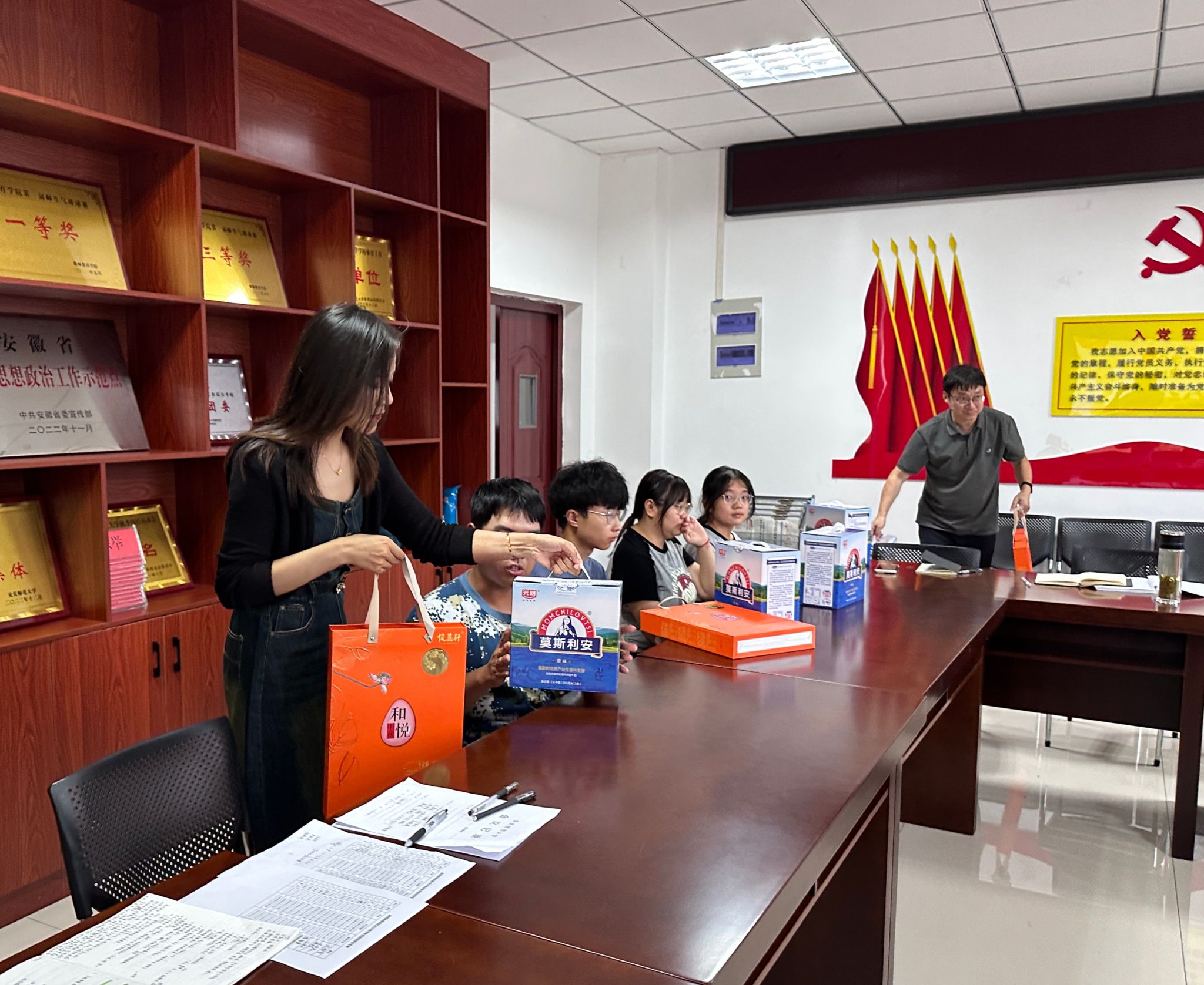 随后,在经过简单的自我介绍后,同学们们敞开心扉,分享了自己入校一段时间的所思所感,会上一片欢声笑语。现场还进行了“爱心礼包”慰问仪式。学院领导为同学们送上月饼、饮品等暖心礼包,勉励大家安心求学、奋发成才。2024级小学教育二班的粱同学表示:“学院的温暖让我们心里非常感动,未来我们一定会规划自己的人生路线,并为之付诸努力,绝不辜负学校的殷切关怀。”