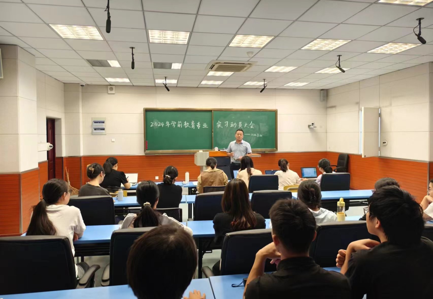 为积极引导2025届学前教育专业毕业生做好教育实习前的各项准备,推进教育实习工作的顺利开展,2024年9月24日,我院2021级学前教育实习生在J511教室召开教育实习动员大会。教师教育学院副院长王皓宇、学前教育教研室全体教师参与了本次实习动员大会。
