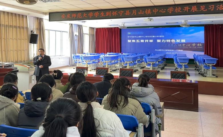 接着,月山镇中心学校党支部书记、校长丁晓禄对前来见习的师生表示欢迎并向大家介绍了学校的发展概况、办学理念、存在的问题及未来的发展规划。他指出,月山镇中心学校是全国青少年足球特色学校,全国青少年人工智能活动特色单位、省级绿色学校,安庆市科普教育特色学校。一直以来,学校秉承“诚信做人、踏实做事”的校训,以“崇尚科学、自主创新”为办学理念并力争办出“志揽明月,德攀高山”的学校特色。