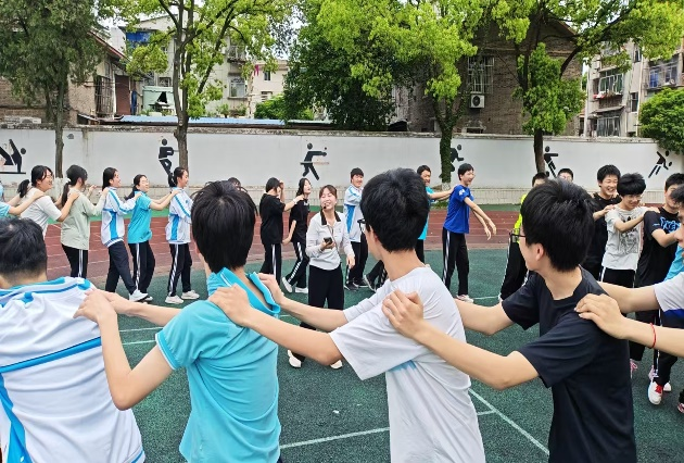 活动中,团队通过一系列心理活动帮助学生缓解压力、提升班级凝聚力。活动伊始,学生们在老师的引导下通过“拍拍操”和“兔子舞”热身,现场气氛迅速活跃。随后,“马兰花开”“龙珠竞速”“鱼跃龙门”及“幸运彩蛋”等环节依次展开,学生们在轻松愉快的氛围中体验合作与挑战,有效释放了备考压力,同时增强了班级凝聚力与沟通能力。