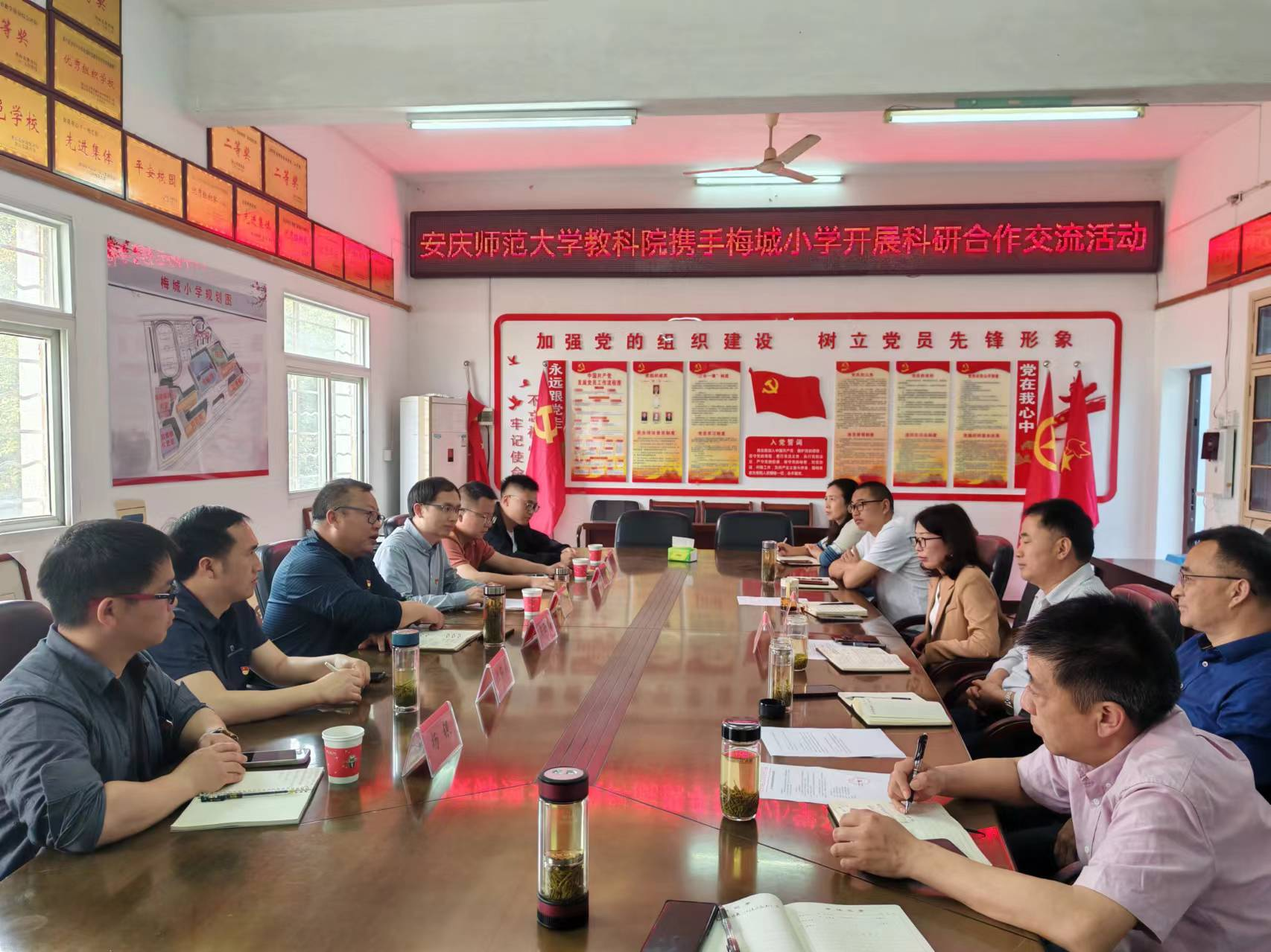 梅城小学校领导热情接待团队一行,介绍了梅城小学的办学历史、校园特色文化建设、课程教学、师资力量等方面的情况。随后,彭文超代表课题组简要汇报所主持的全国教育科学规划项目“意义世界视域的新时代儿童美好心灵培育研究”的研究进展情况。课题组成员、梅城小学校长周葛林介绍梅城小学在培育“美(梅)好少年”方面的实践经验和特色成果。双方就课题组以梅城小学为研究对象开展相关主题研究的方案进行了讨论。吴云助和潜山市教育局基教科领导分别作指导。团队还与梅城小学就其校园文化创建和成果总结提炼、校本课程开发、名师团队创建等事宜开展合作洽谈,并达成合作意向。