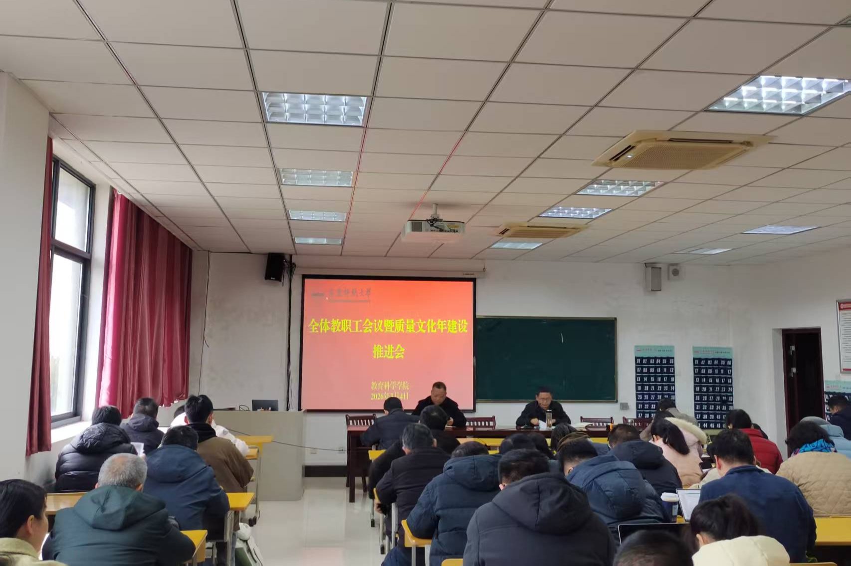 3月4日下午,学院召开全体教职工会议暨质量文化年建设推进会。会议由学院党委书记何孔蛟主持,全体教职工参加会议。