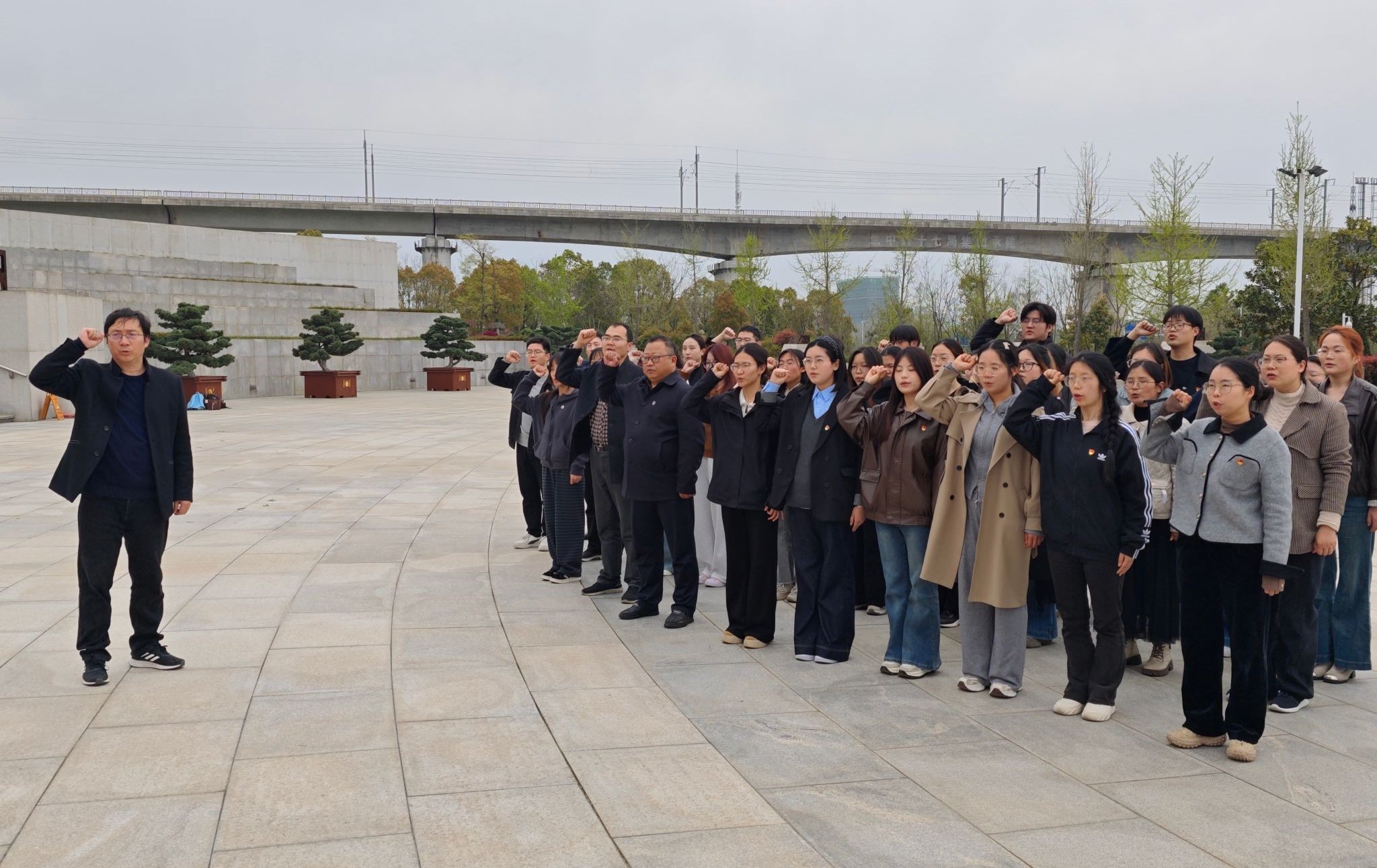 在纪念广场,全体党员面向鲜红党旗,高举右拳,庄严重温入党誓词。“我志愿加入中国共产党,拥护党的纲领,遵守党的章程……” 铿锵誓言在陵园上空久久回荡,彰显出新时代教育工作者与青年学子传承红色基因、赓续红色血脉的坚定决心。