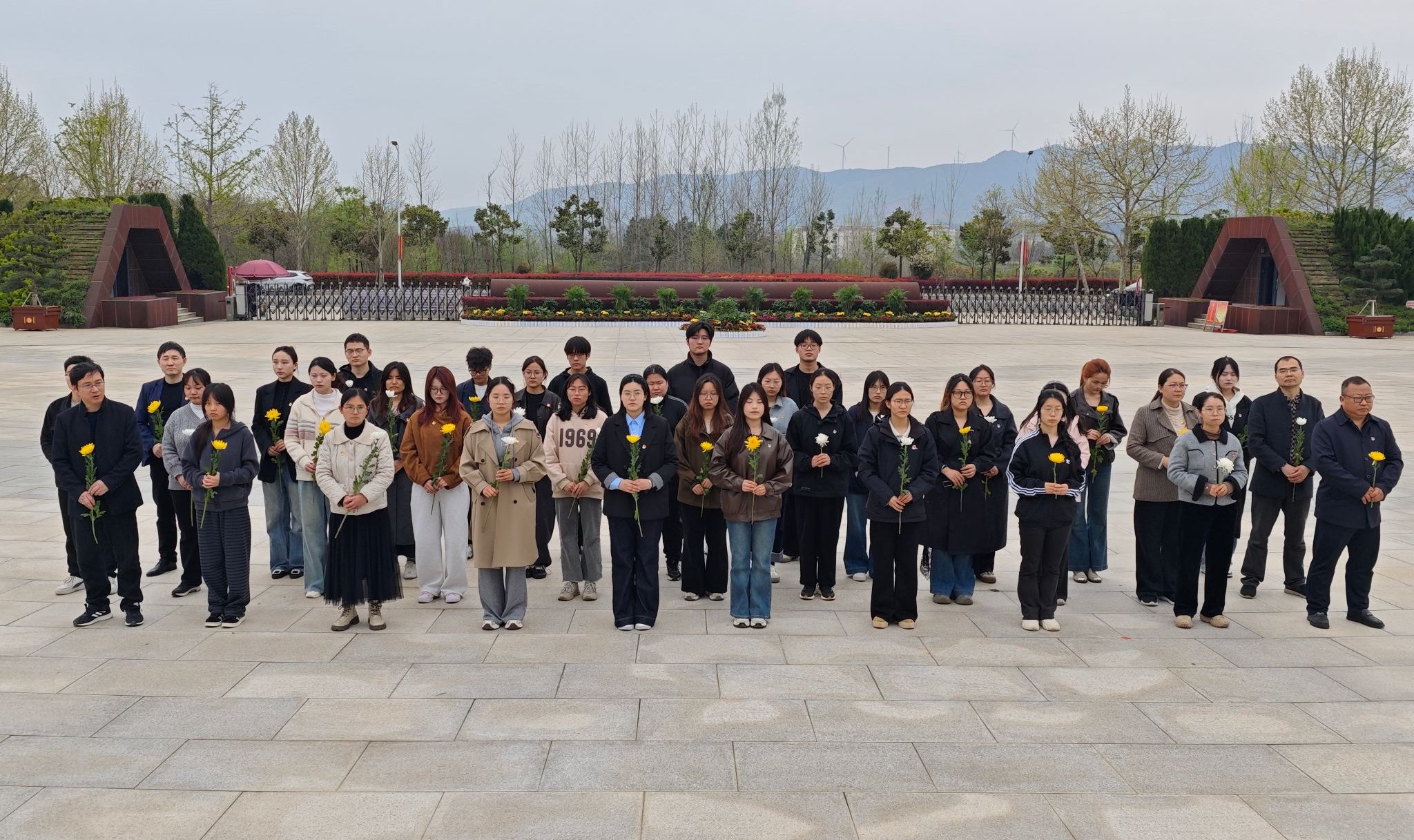 苍松翠柏环抱,陵园庄严肃穆,巍峨矗立的五星革命烈士纪念塔,见证着先烈们的不朽功勋。学院党委委员、院长吴云助代表全体师生敬献花篮、整理缎带。全体人员整齐肃立,向为民族独立、人民解放和国家富强英勇献身的革命先烈三鞠躬。随后师生们依次为革命先烈献上鲜花,朵朵素菊寄托着深切追思与崇高敬意。
