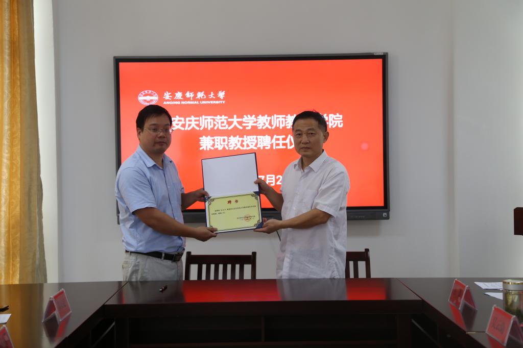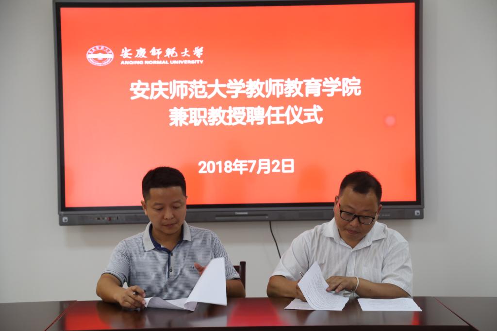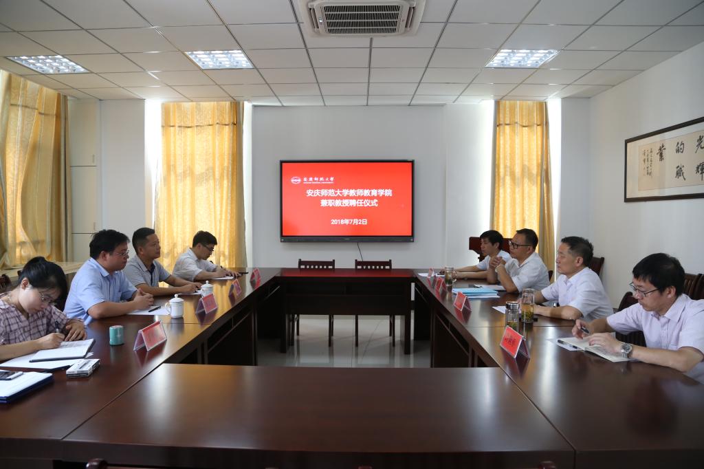 2018年7月2日上午,教师教育学院在学院会议室为岭南师范学院陈金圣教授和广西财经学院谢凌凌教授举行兼职教授聘任仪式,学院领导班子曹长德书记、吴云助院长、许世平副书记出席聘任仪式,聘任仪式由汪洋副院长主持。