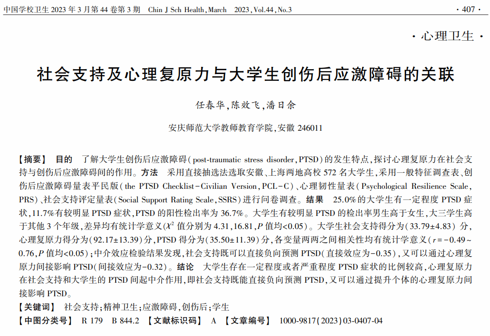任春华,陈效飞,潘日余:社会支持及心理复原力与大学生创伤后应激障碍的关联
