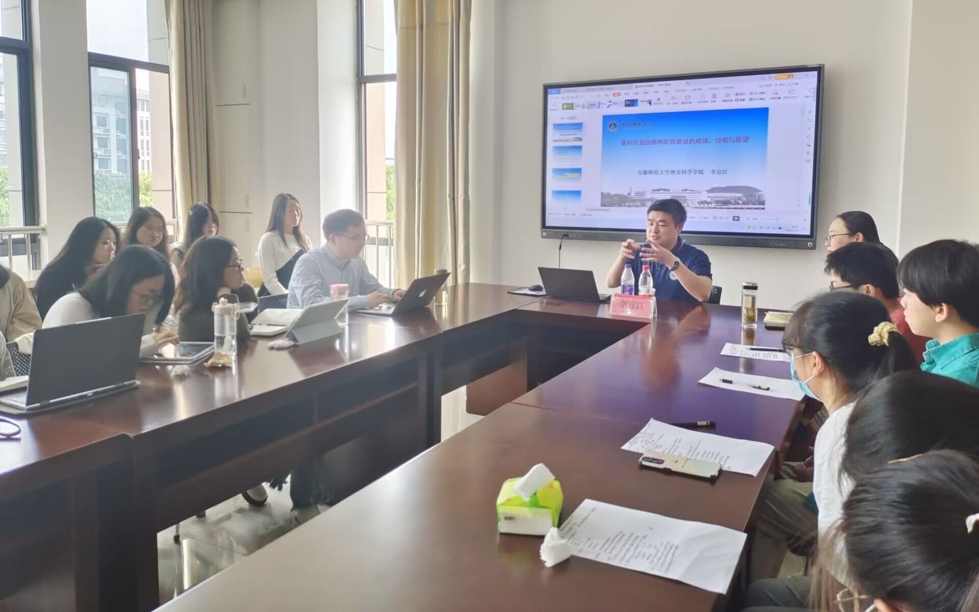 5月13日上午,安徽师范大学365上市公司院长、教授、博士生导师李宜江在J202开展题为“新时代我国教师队伍建设的成就、经验与展望”的学术交流会,会议由副院长诸园主持,教师教育学院部分硕士研究生及本科生、教师现场聆听。
