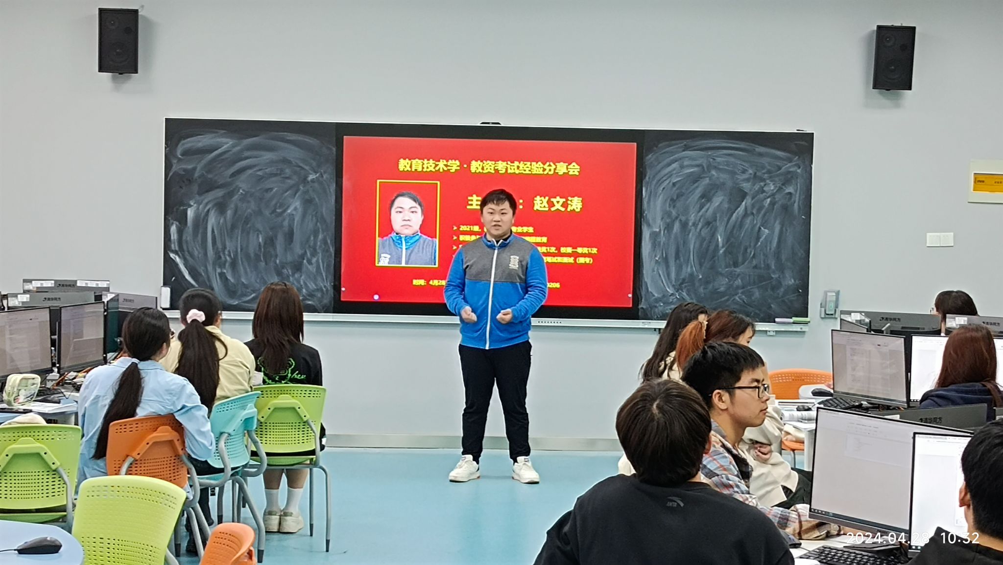 2024年4月28日,教育技术系在D206教室组织召开教师资格证考试经验分享交流会。教育技术学专业2021级学生赵文涛担任主讲,2022级教育技术学专业全体学生参加此次活动。交流会由系主任韦伟主持。