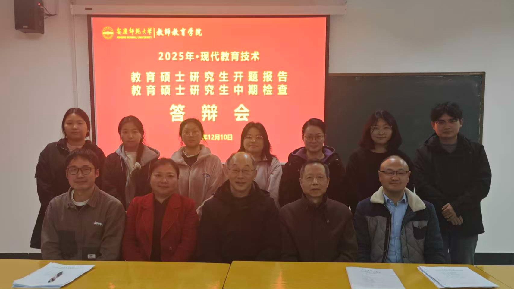 为强化研究生培养过程管理,严把学位论文质量关,切实提升教育硕士人才培养的针对性与实效性,12月10日下午,我院现代教育技术专业开展教育硕士开题报告与中期检查专项工作。本次活动邀请基础教育一线教育专家江浩(安庆市现代教育技术中心,正高级教师)、王志萍(安庆市第十四中学,高级教师),以及校内教师韩建华、韦伟、朱斌彬、方申荣组成评审小组。现代教育技术专业全体研究生和教育技术学专业部分本科生参加活动。