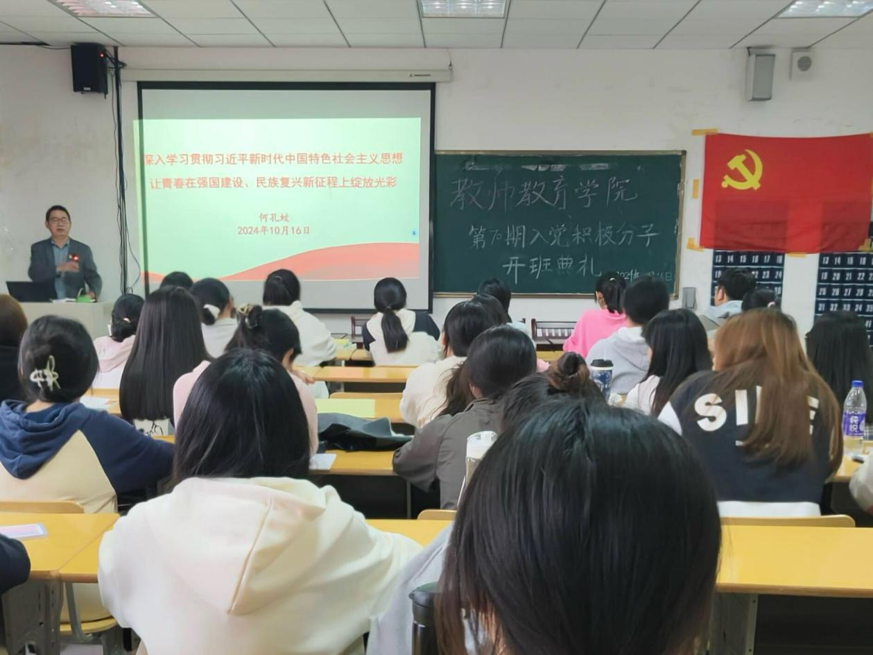 开班后,何孔蛟以“深入学习贯彻习近平新时代中国特色社会主义思想,让青春在强国建设、民族复兴新征程上绽放光彩”为主题为学员做党课第一讲。他详细阐述了习近平新时代中国特色社会主义思想创立的时代背景和思想渊源,习近平新时代中国特色社会主义思想的的核心要义、实践要求,习近平新时代中国特色社会主义思想的的世界观、方法论和贯穿其中的立场观点方法,习近平新时代中国特色社会主义思想创立的重大意义。他还结合现实案例与自身学习体验,勉励入党积极分子提高思想觉悟、端正入党动机,争做有理想、敢担当、能吃苦、肯奋斗的新时代好青年,让青春在全面建设社会主义现代化国家的实践中绽放绚丽之花。(撰稿:张妍、林丹 摄影:李艳丽、徐颖 审核:汪洋洋、何孔蛟)