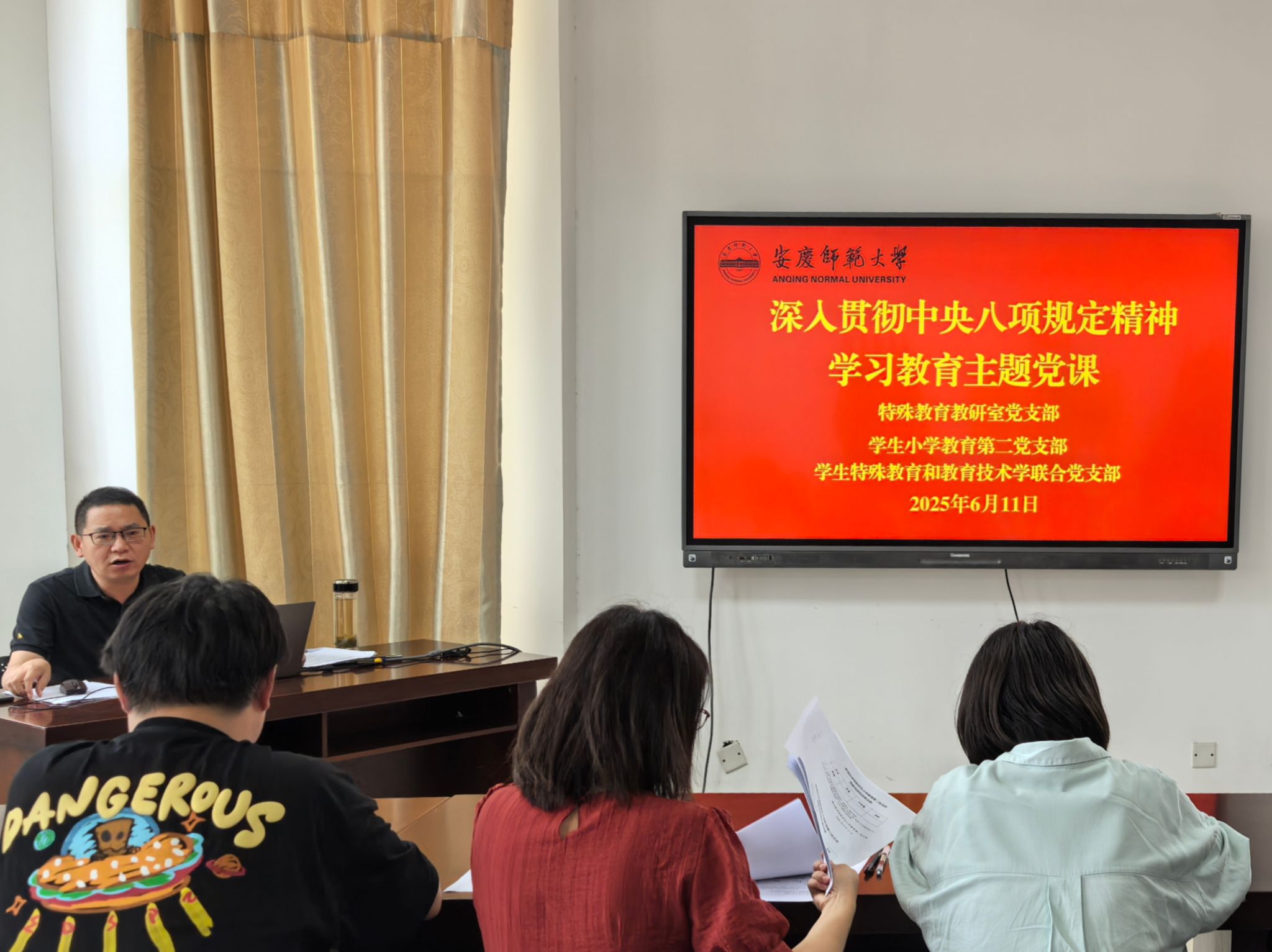 6月11日,365上市公司党委书记何孔蛟在J202会议室为特殊教育教研室党支部、学生小学教育第二党支部、学生特殊教育和教育技术学联合党支部党员讲授深入贯彻中央八项规定精神学习教育专题党课。