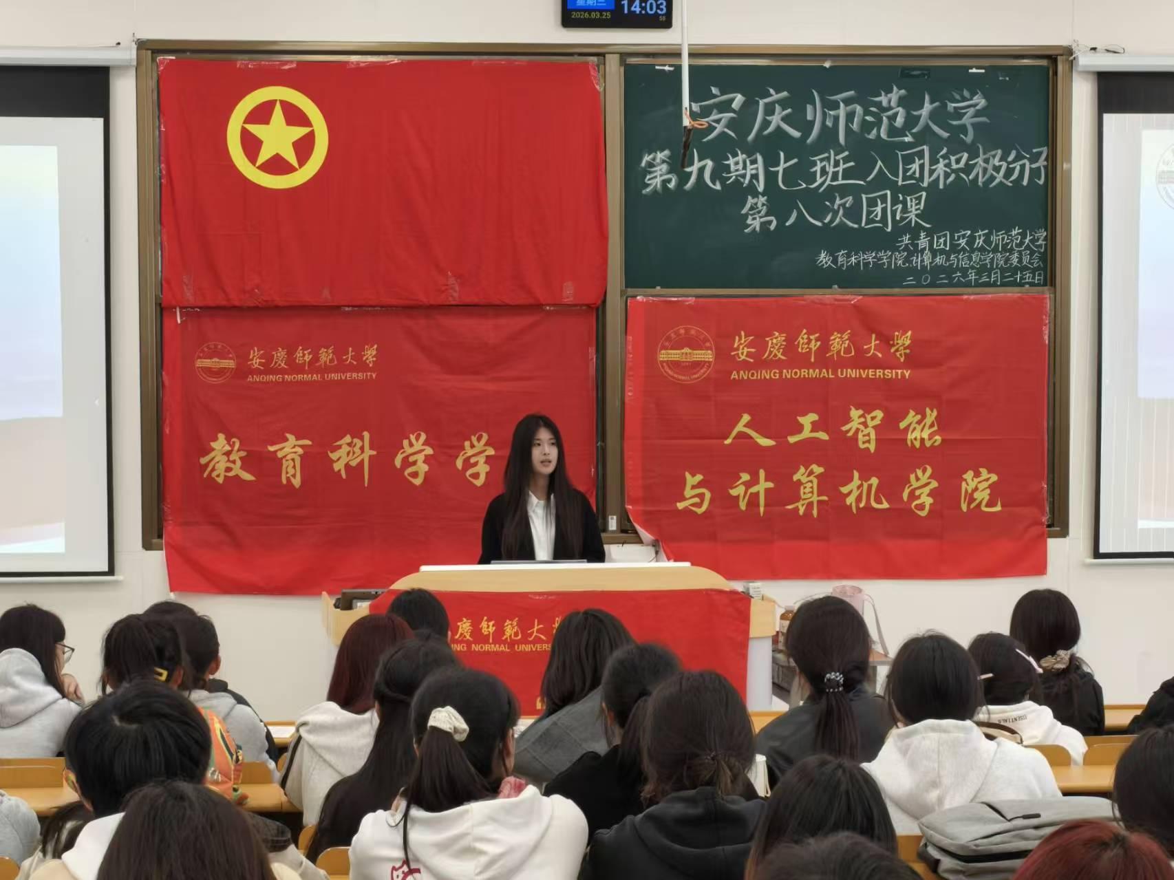 3月25日,我院联合人工智能与计算机学院于C108教室联合举办第九期入团积极分子第七班第八次主题团课。本次团课由大学生青年新声宣讲团外联部部员王心怡、炎彧帆、胡雅涵主讲,两院入团积极分子到场参加。