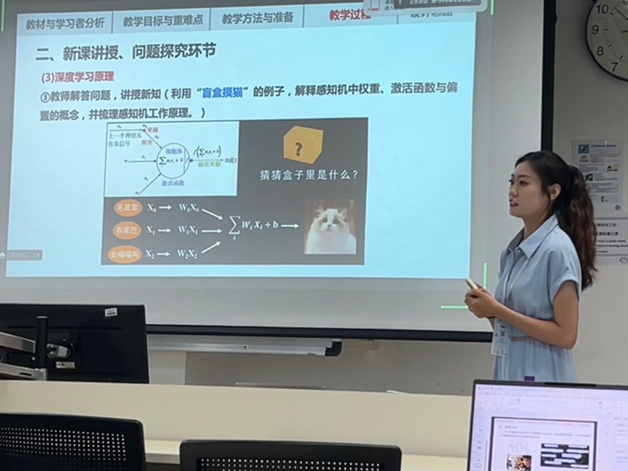 在“跨学科学习(STEAM)课程与教学设计”专题会场,现代教育技术专业研究生郝静婷作题为《初识深度学习》的跨学科主题探究学习实践案例报告。该案例紧贴时代发展的脉搏,将知识进行跨学科整合,通过引导学生主动思考、交流、展示等教学手段使中学生了解和熟悉以神经网络为基础的深度学习,从而建构人工智能知识框架。